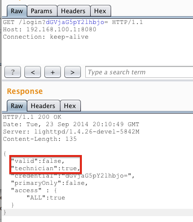 {"valid":true,"technician":false,"credential":"admin:password","primaryOnly":false,"access":{"ALL":true},"name":"admin"}Sweet, the device is sending your credentials on every authenticated request (without HTTPS), essentially they have created basic-auth 2.0 - As the kids say "YOLO". The part that stuck out to me is the "technician" value that is set to "false" - swapping it to "true" didn't do anything exciting, but after messing around a bit I found that the following worked wonderfully: